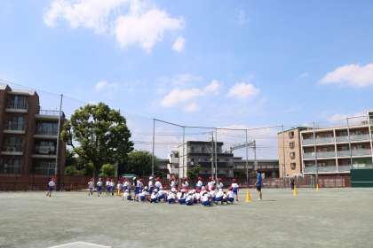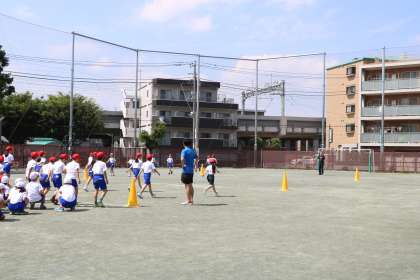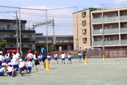 「体つくり運動・走の運動」です。いろいろな歩き方、走り方に挑戦し、楽しみながら身体を動かしました。急な激しい運動は、体調不良やけがにつながるので、水分を補給しながらゆっくり体を動かします。