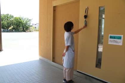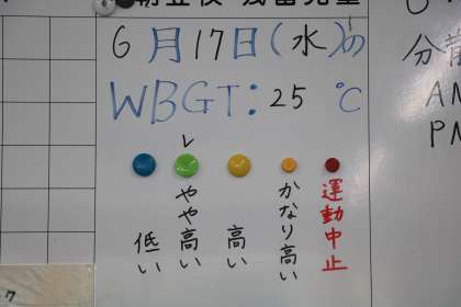 学校では、熱中症指数を定期的に測定、職員室のホワイトボードに記入し、教職員が活動の指針にしています。