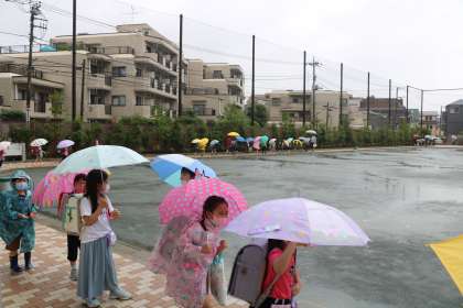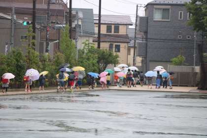 下校時刻となりました。梅雨の時期になりました。傘をさしての登下校、車に気を付けて道路を歩いてください。