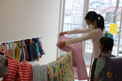 朝は強い雨の中、1年生は初めて雨具の片づけなどを経験しました。