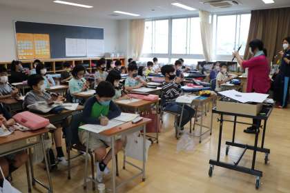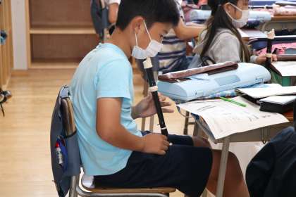 飛沫予防のために、ICTを使ったり、専科教室ではなく教室を使ったり、どの教科も工夫して授業をしています。音楽は、曲を聴きながらリズムを刻んだり、リコーダーの指づかいを「あごリコーダー」で練習したり。子供たちは真剣に学習していました。