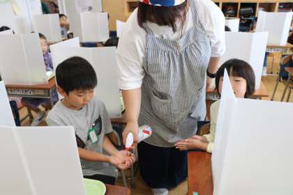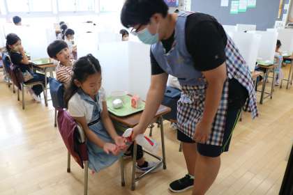 配膳が完了しました。給食当番も席につき、全員マスクを取りました。最後に猫の手をしているところに、先生が消毒液を噴霧し手指の消毒をしてからいよいよ「いただきます!」