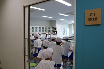 学校探検をする1年生。今日は3・4階を中心に回っています。