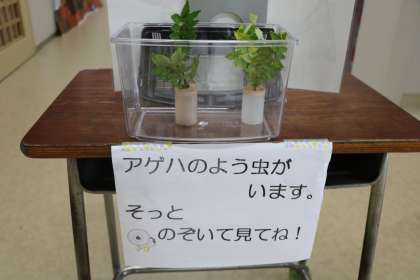 通るたびに覗き込み、「あれ?いない」「あ〜こんなところに移動していた」「葉をたべているかな?」と熱心に観察しています。