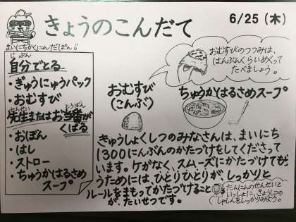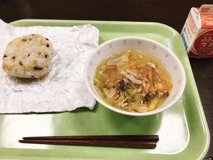 今日は、おむすび(昆布)、中華春雨スープ、牛乳です。