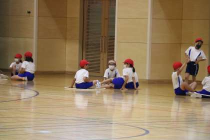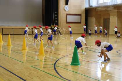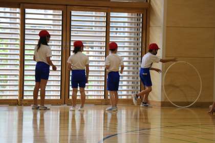 3年生体育「体つくり運動」です。用具を使った動きや、体のバランスを取る動きを学習しました。「フラフープを転がしながら走るためには何に気をつけたらいいか班で話し合ってみよう!」と先生が声をかけると、それぞれ、目線、姿勢、転がし方などなど自分の体験から考えられることを出し合い、実際に用具を手に取りながら話し合っていました。