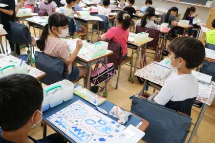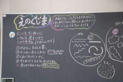2年生図工の様子です。「えのぐじま」を描く前に、まず練習です。筆の動かし方、水の量、絵具の量、筆のどの部分まで使うかなど、いろいろなことを試しながら練習してから、本番に臨みます。
