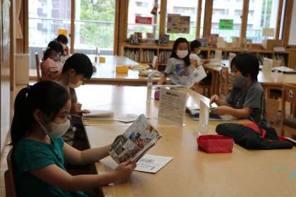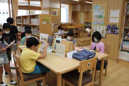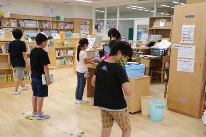 子どもたちの大好きな図書の時間です。司書の先生のところに集まって読み聞かせを行うことはまだ控えていますが、子どもたちは思い思いの本を手にとって静かに本を読んでいます。本を読む座席だけでなく、本の返却の時の待ち列も、ソーシャルディスタンスを守れるように工夫している図書室です。動物の足跡の上に立って並びます。さあ何の足跡かな?答えは次に進むとわかります。
