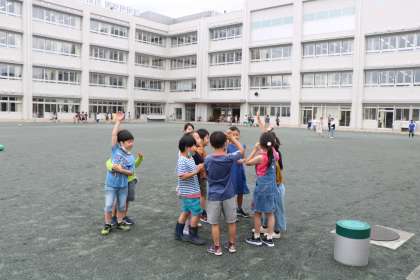 今日は、低学年の朝遊びです。1年生は来週から朝遊びデビューなので、今日は2年生と3年生が校庭で遊びます。鬼決めじゃんけんも楽しそう!先生たちも共遊びを楽しんでいます。