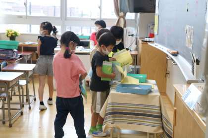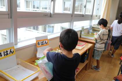 朝の支度の時間1年生の教室の様子を見に行きました。宿題のひらがなプリントや、健康観察表を決まった場所に提出したり、ランドセルの用具を机にしまったり、手伝いに来てくれる6年生が温かく見守る中、だいぶスムースに一人でできるようになってきた1年生です。