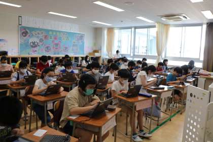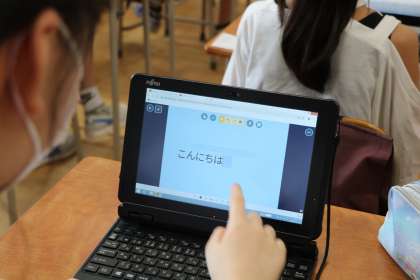 ロイロノートの使い方学習の様子です。自分のIDでログインし、データを提出します。提出するものについては自分でできることをいろいろ試しています。全員が、提出したものを見ることができるので、全員で共有して次の学習に発展させることができます。