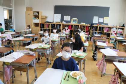 2年生の給食準備の様子を見に行きました。サラダ一人分の分量を、全体を見て考えながら配膳しています。待っている子たちも、とても静かです。