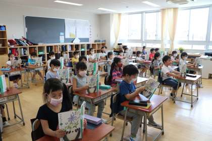 1年生の教室から、元気に教科書を読む声が聞こえてきます。どれどれ?聞きに行くと、みんなしっかり教科書を手にもち、良い姿勢で音読しています。とてもリズムよく、聞いているほうはもちろんですが、声を合わせて読んでいる子どもたちも、とても気持ちよさそうです。
