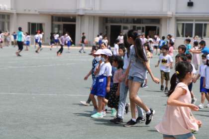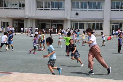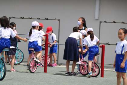 今日の校庭は低学年が遊べる日です。6年生のお兄さん、お姉さんが1年生と遊んでくれたり、一輪車の高さを調節してくれたりする姿も見られます。