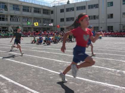 中学年の「80メートル走」、1年生による「ふりふりたまいれ」