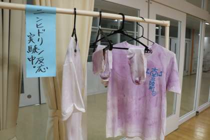 6年生家庭科学習の様子です。授業の始めに、数時間しか着用していない服が汚れていると思うか子どもたちに聞くと、ほとんどの子どもが「あまり汚れていない」と答えます。そこでニンヒドリン溶液を用いて、汚れを確かめる実験をしました。ニンヒドリンは、たんぱく質や尿素などに反応して青紫に発色し、衣服に付着した汗や垢などを検出することができる薬品です。数時間着たもの、一日着たものなど数枚を同様に実験すると写真のような結果が出て、子どもたちはびっくりです。汗をかくこの時期、今まで当たり前と思っていた過ごし方を見つめなおし、気持ちよく衣服を着るための自分なりの方法を考えるきっかけになるといいです。