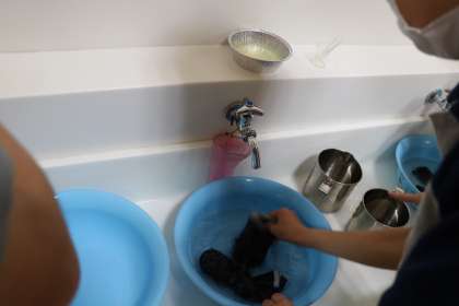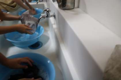 写真は、洗濯実習をしているところです。水と洗剤の量をきちんと測ってから洗濯を始めます。