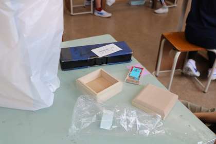 6時間目は、図工室に移動して学習です。今日から新しい教材「私はデザイナー12歳の力で」に取り組みます。今日は、印箱のデザインを考えます。