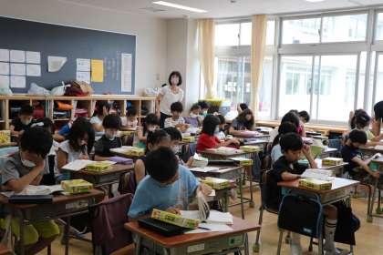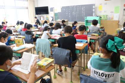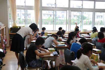 同じ音で意味の違う言葉を見つけよう、という学習です。人の名前や、難しすぎず、3年生みんなが分かる言葉という限定付きで、辞書を片手に書きだしています。真剣に学習に取り組んでいます。
