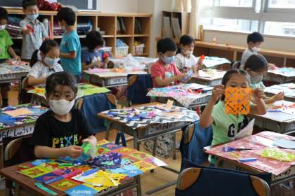 「チョッキンパでつくろう」に取り組んでいます。右手ではさみをもち、左手で折り紙を動かしながら切ると、思ったように切れます。たくさん経験して、体で覚えていく子どもたちです。
