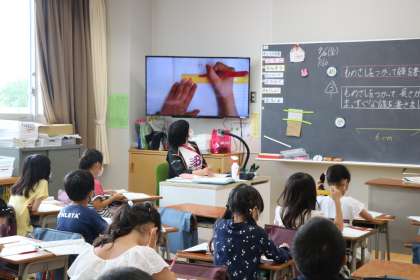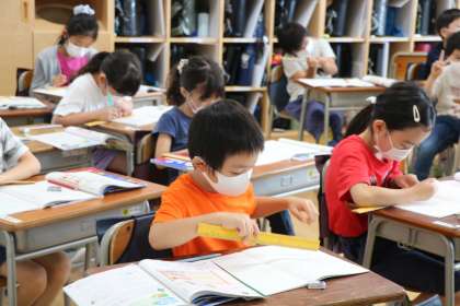 2年生が、算数「長さ」の学習をしています。ものさしを使い、長さが測れるようになったら、次は指定された長さの直線を引く練習です。目盛りの仕組みを復習しながらものさしを使います。