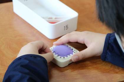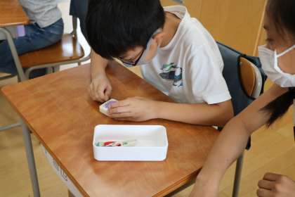 「ひと針に心をこめて」の学習です。2人に1セット裁縫セットが用意されています。針山にどのように針を刺すか、糸切りばさみはどうやって使うか、針やはさみを使う緊張感漂う中、集中して先生の説明を聞き、チャレンジしています。