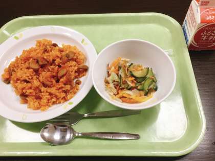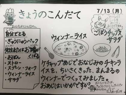 今日は、ウィンナーライス、ごぼうチップスサラダ、牛乳です。