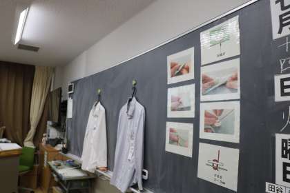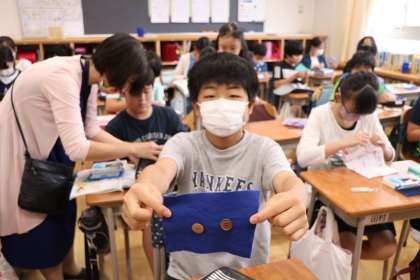 衣服の手入れ、洗濯の表示、ボタンの役割などについて学習した後、いよいよボタンを布に縫い付ける練習です。しっかり、正しく布に縫いつけることができています。