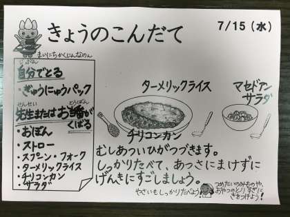 今日は、ターメリックライス、チリコンカン、マセドアンサラダ、牛乳です。