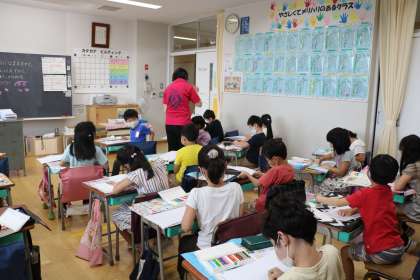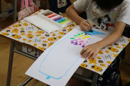 長い形の紙から描きたいことを考えたり、試しに描いたり思いを膨らませています。本当にあるもの、あったらいいなと思うもの子どもの発想は様々で、楽しそうです。