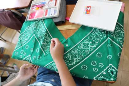 家族や自分の生活を、楽しく便利にするための作品を考えます。ぞうきん、あずま袋、ティッシュケースなど、家にある布を持ってきて制作に取りかかります。