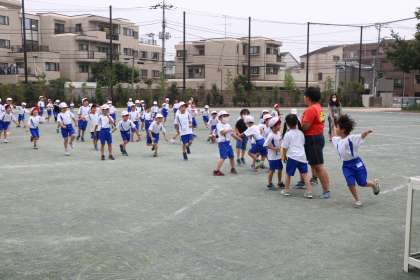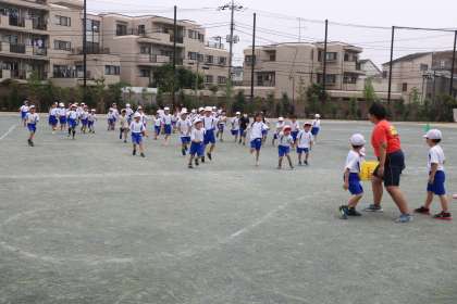 最後は「けんけんだるまさんがころんだ」を全員でやります。けんけんで進むのより、ピタッと止まることが難しい難しい。先生に次々と「あ!うごいた」と言われてしまいます。