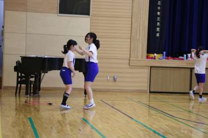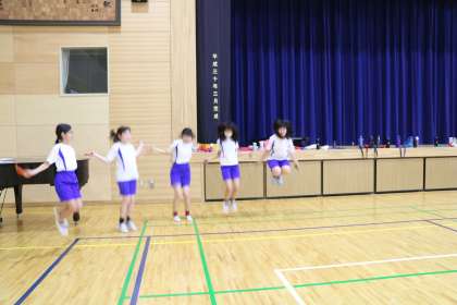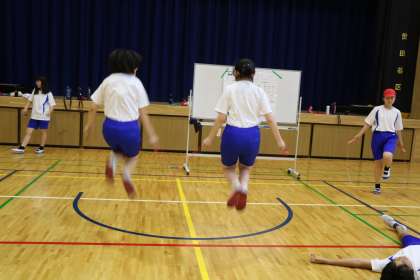 短縄を使って、友達と跳び方を工夫した技に挑戦です。