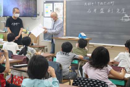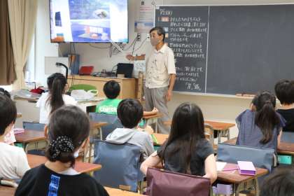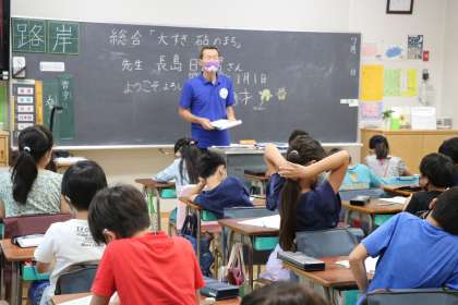 「大好き!砧の町」の学習です。砧の町をよく知るために、今日はゲストティーチャーの方に来ていただきました。ゲストティーチャーの方は、学校支援コーディネーターの皆さんから依頼していただいた、子どものころからこの砧の地で育った町会の方々です。