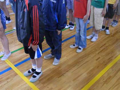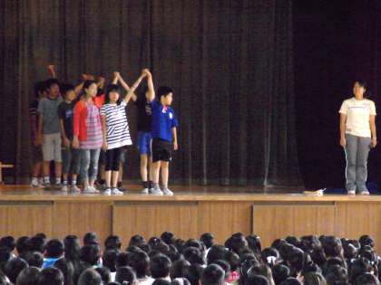 今日の体育朝会は、グランドコンディションが悪いので体育館で集団行動について確認しました。「気をつけ」の姿勢、「前へならえ」の手の上げ方、「右向け右」「左向け左」「まわれ右」の仕方も確認しました。最後に、水泳指導中に使う「バディ」による人数確認の仕方を体育委員会のみんなにやってもらいました。安全な水泳指導、しっかり心がけていきます。
