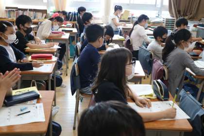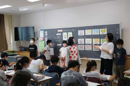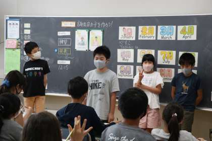 「誕生日カレンダーを作ろう」の学習の様子です。友達の誕生日を聞いて記録し、カレンダーを作ります。誕生日はもちろん英語で何月何日と言い、その後、誕生日にほしいものも発表します。友だちの発表を真剣に聞く子どもたちです。