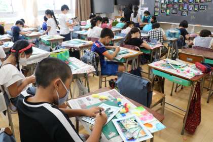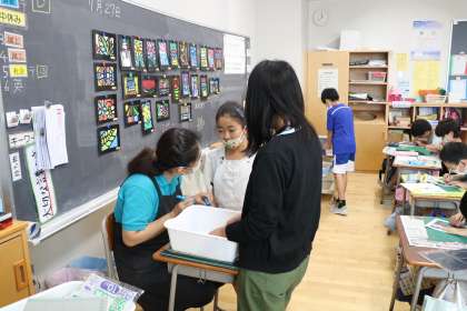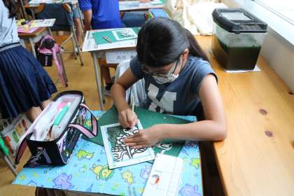 美しいステンシル作品にするために、いくつかのポイントを全員で確認した後制作に取り掛かります。どの子も、自分の作品に夢中です。