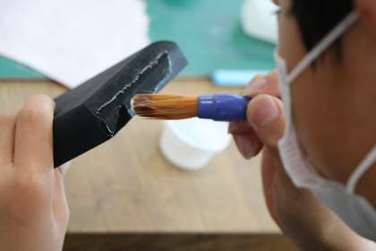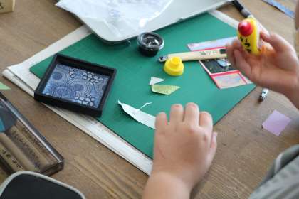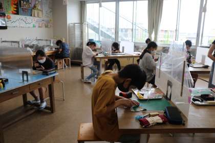 「わたしはデザイナー12才の力で」の様子です。和紙の組み合わせを工夫して印箱を装飾します。色合い、模様を考え、和風デザインを工夫しています。最後にニスを重ねると、漆器のような風合いに。ますます中に入れる作品が大切になってきます。