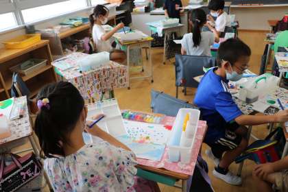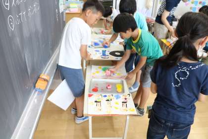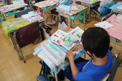 「すきなことなあに」の絵を描いている様子です。絵をクレヨンでしっかり描くことも一生懸命ですが、画材に筆やスポンジを使って、より効果的な表現の仕方を工夫しています。