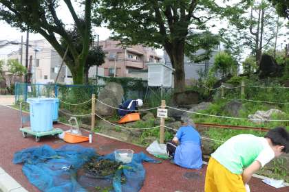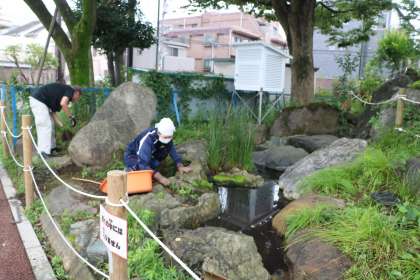 山野の山にあるビオトープの大掃除が始まります。池にかけてあった大きな網は、改築中少しでも外来生物や落ち葉が入らないようにとかけてありました。本来ですと、3月31日に学校運営委員のご協力で、清掃プロジェクトを立ち上げ、有志の子どもたちと一緒に大掃除をする予定でした。休校となり、それはできなくなりましたが、2学期から、理科の学習や委員会活動ですぐに使えるように、主事さんたちの大掃除が始まりました。まだまだ、雑草を抜いたり、池をきれいにしたり清掃は続きます。