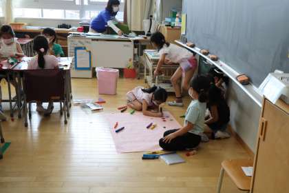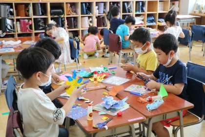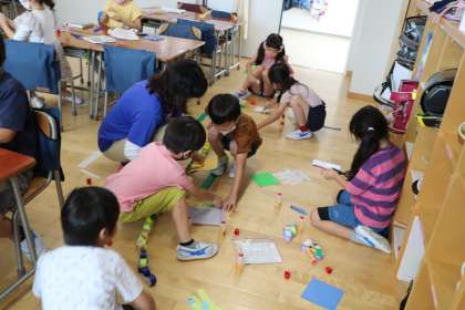 今日は「がんばったねパーティー」だそうです。プログラム1番。みんなでパーティーの飾りつけ…です。仕事を分担して、協力しながら進めます。