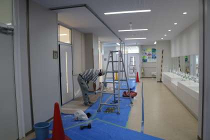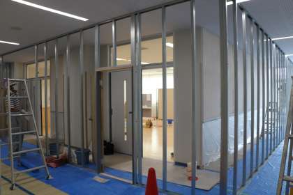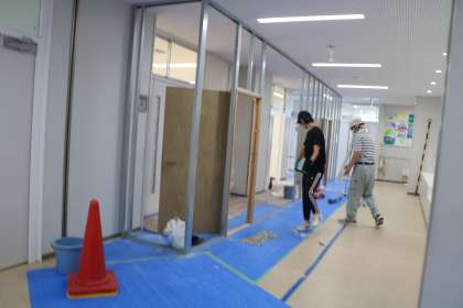 2階オープンスペースの教室化工事の様子です。工事用の仮囲いが外されました。