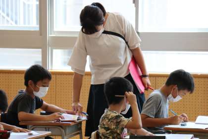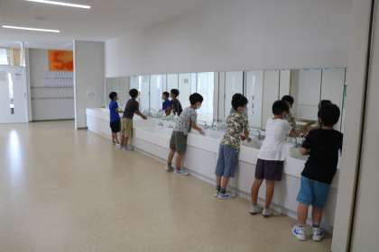 写真は3年生の様子です。受付をして教室に入ったら、まずは手洗いです。