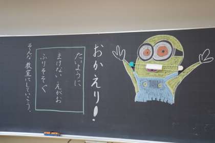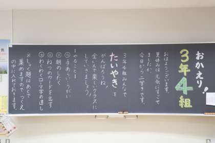 今年度は1学期は9月30日までとなっていますが、子どもにとっては2学期がスタートです。子どもたちを待つ教室の黒板には「おかえりなさい」の言葉も見られます。