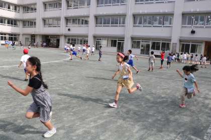 チャイムと同時に、校庭に元気よく飛び出してくる低学年の子どもたちです。