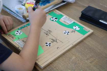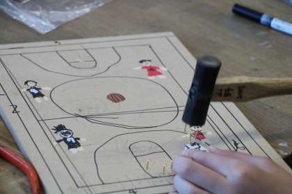 「くぎうちトントン」の学習の様子です。夏休み前、下絵作りの様子を見ていたので、色がついて、くぎを打ち始めるといよいよ「コリントゲーム」らしくなってきました。それぞれ、ここにビー玉が入るとホームランだから得点を高くしよう、とか、高得点のところにビー玉を進み辛くするために考えてくぎを打とうとか、子どもたちの工夫がたくさん見られます。