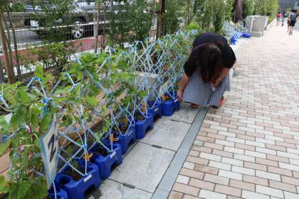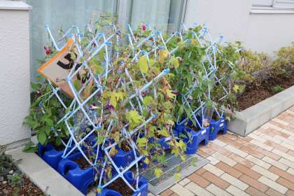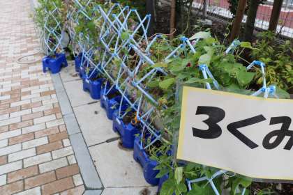 朝顔も、強風対策でなるべくまとめて置くようにご協力いただいています。ありがとうございます。