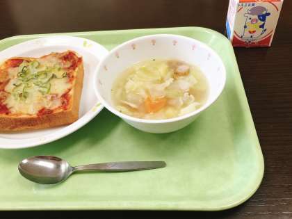 今日は、ピザトースト、ポトフ、牛乳です。