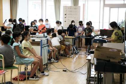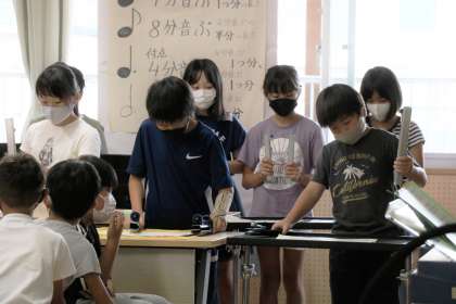 5年生音楽の様子です。感染症対策で様々配慮する中、トーンチャイムという楽器を中心に合奏を楽しんでいる様子です。子どもたちにもなじみのある曲ですが、演奏するのはなかなか難しいようです。しかも初めて経験するトーンチャイム。友だちの音を聞きながら、楽譜を見ながら真剣に取り組んでいます。