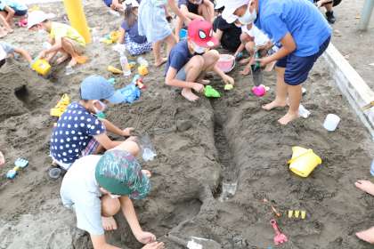 今日も「土あそび」の様子です。水をたっぷり使って土あそびするのに、ちょうどよい天候です。